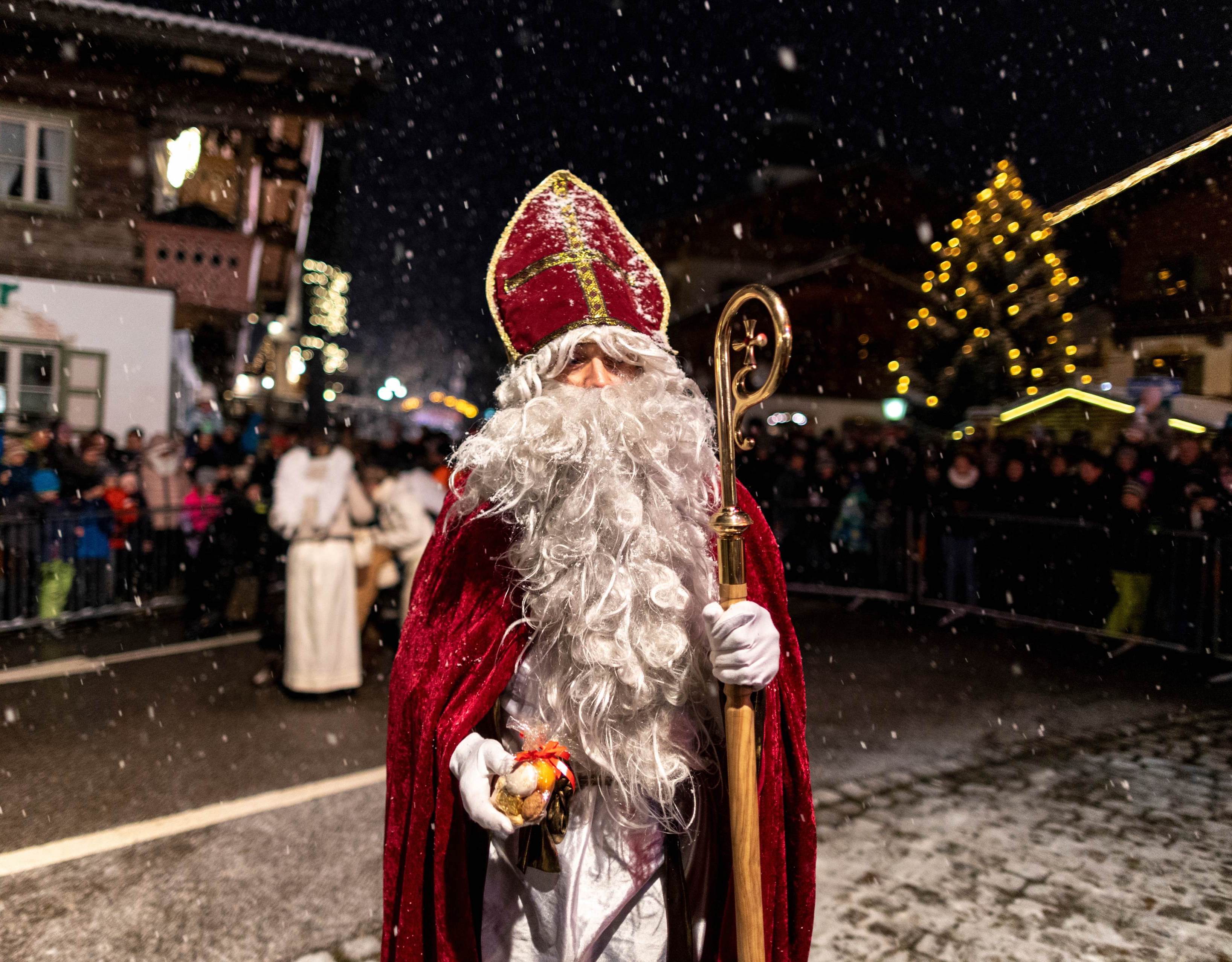 In molte località, il santo si sposta su un carro trainato da cavalli o in groppa a un asino, portando con sé un grande sacco colmo di regali. I bambini che si sono comportati bene ricevono dolci, mandarini, noci e piccoli giocattoli, mentre quelli meno bravi devono vedersela con i Krampus: figure demoniache travestite. Questo contrasto tra bene e male ha origini profonde nella tradizione cristiana.