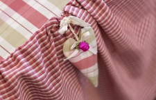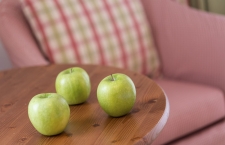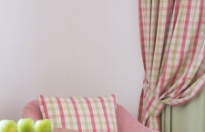 Le tonalità calde del legno si contrappongono e si amalgamano con elementi di colore viola e rosa, creando un'atmosfera accogliente e familiare.