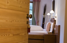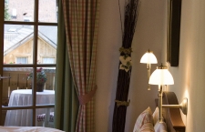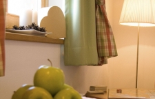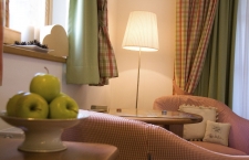 Elementi in legno si sposano con grazia ed eleganza a complementi d'arredo dalle tonalità rosa e verdi creando un'atmosfera che richiama appieno la tradizione altoatesina.