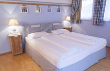 Zur Ausstattung des Zimmers gehört ein Badezimmer mit Dusche, Terrasse mit Blick zum Piz de Plaies und Fenster zum Ortskern von St. Vigil in Enneberg.